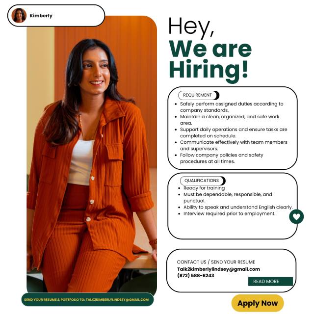 Send your resume to:Talk2kimberlylindsey@gmail,com